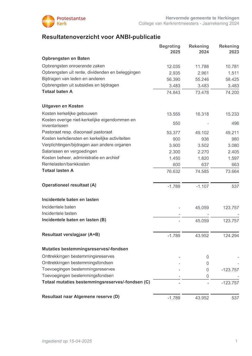 De kerkenraad heeft de algemene eindverantwoordelijkheid voor het in stand houden van een levende gemeente. Dat doet zij door zoveel mogelijk gemeenteleden in te schakelen bij het plaatselijk werk. Enkele taken zijn conform de kerkorde gedelegeerd naar afzonderlijke colleges, waaronder het College van Kerkrentmeesters en het College van Diakenen. Zij waken over de financiële slagkracht van de gemeente en leggen via een jaarverslag rekening en verantwoording af aan de kerkenraad. Een uittreksel van de belangrijkste gegevens treft u hieronder aan.